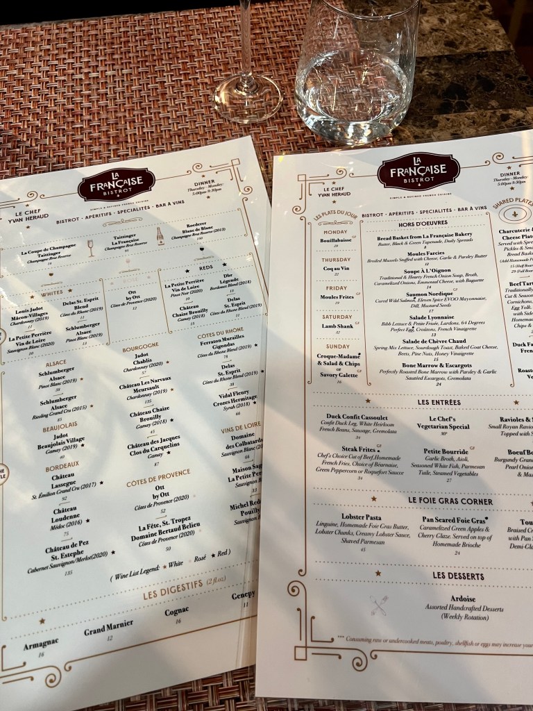 Le Francaise Bistrot is open Thursday through Monday from 5-9:30 pm.