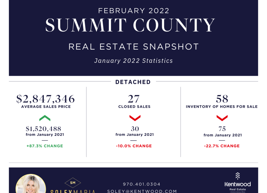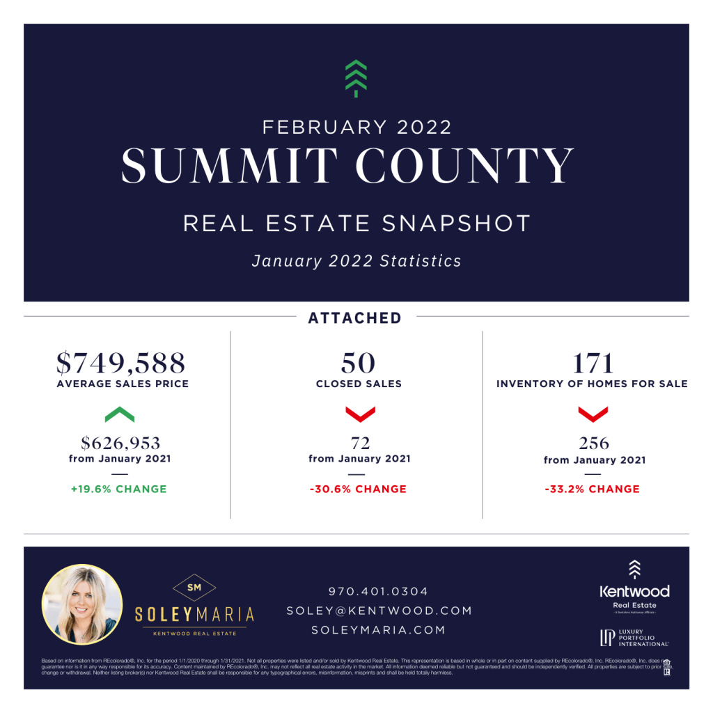 Summit County continued the trend of increasing prices and inventory shortages, translating into fewer units sold, for the month of January. Prices rose almost 20% for condos and townhomes with just over 30% decreases in both number of closed sales and inventory, with levels being even lower than in December.