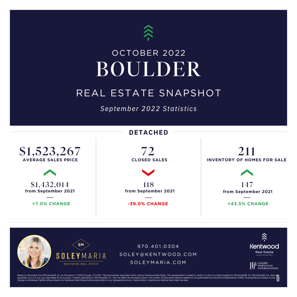 The single family home market in Boulder showed a 7% increase in average price YOY, coming in at over $1.5M. At the same time, the number of closed sales dropped by almost 40% from 118 in September 2021 to 72 in September 2022, with inventory seeing an increase of a similar magnitude sitting at 211 homes for September 2022.