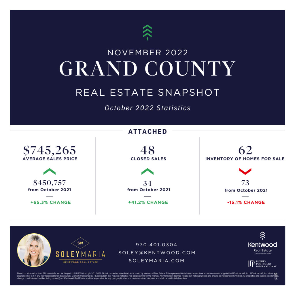 Grand County continues to be an outlier amongst the different mountain communities I work in. In October the average price of a single family home was $1,259,918, compared to $797,151 in October 2021 – a 58.1% increase! Some of that can be attributed to 5 of the 39 sales being expensive new construction, which is booming in Grand County – please reach out personally if that’s something you want more information on.