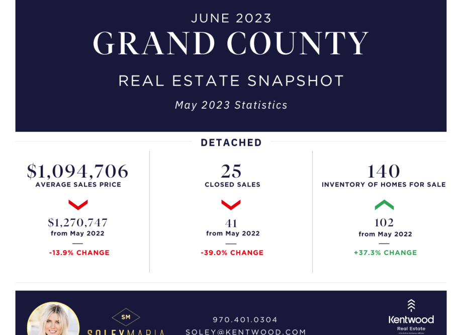 Grand County saw a -13.9% decrease in the prices of single family homes from a year ago, still crossing $1M at $1,094,706. Similar to surrounding mountain communities closed sales are down for single family homes (-39%) and inventory is up (+37.3%) from May 2022.