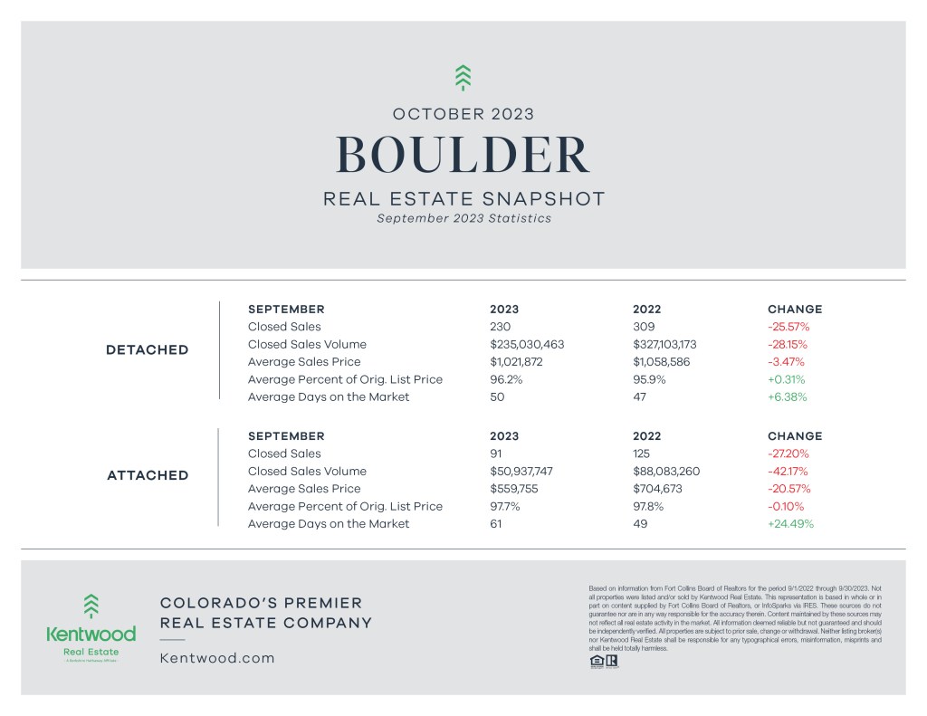 The Boulder market showed a significant drop in both the number of sales closed and sales volume, both for detached and attached homes. However, prices of single family homes dropped by -3.47% from September 2022 to September 2023, while condos and townhomes dropped by over -20% in average sales price in the same period. Days on market were relatively flat year over year, but inventory was up; 6.38% for detached homes and 24.49% for attached homes.