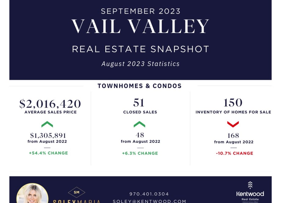 Per VBR, new Listings were down 22.6 percent for the Single Family-Duplex category but increased 7.0 percent for the Townhouse-Condo category. Pending Sales decreased 14.6 percent for Single Family-Duplex but increased 14.9 percent for Townhouse-Condo. The Median Sales Price was up 93.8 percent to $2,510,000 … Continue reading Vail Valley October 2023 Market Update