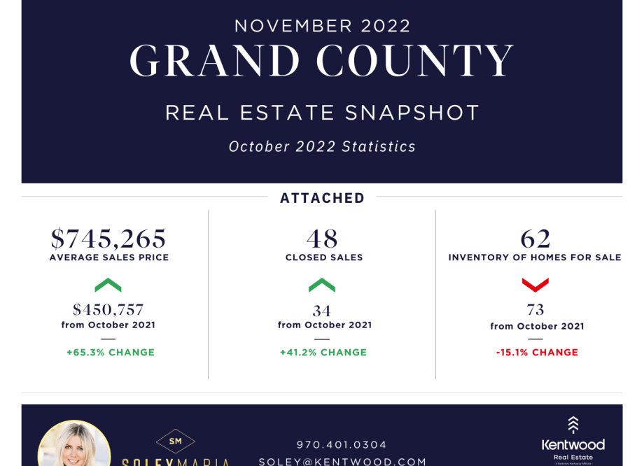 Grand County continues to be an outlier amongst the different mountain communities I work in. In October the average price of a single family home was $1,259,918, compared to $797,151 in October 2021 – a 58.1% increase! Some of that can be attributed to 5 … Continue reading November 2022 Grand County Market Update